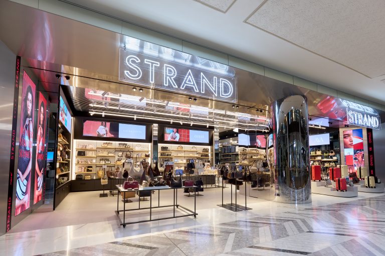Anchored by a sleek black ceiling, crisp lighting lines, and a standout neon sign at the entrance, the new design elevates the store’s presence while drawing customers into a space that feels both premium and accessible. Inside, a refined mix of materials – mirrored columns, polished displays, and neutral flooring complements the organised layout of travel gear, handbags, and accessories.